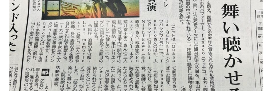 『亀山トリエンナーレ』公演の取材が中日新聞に掲載されました!